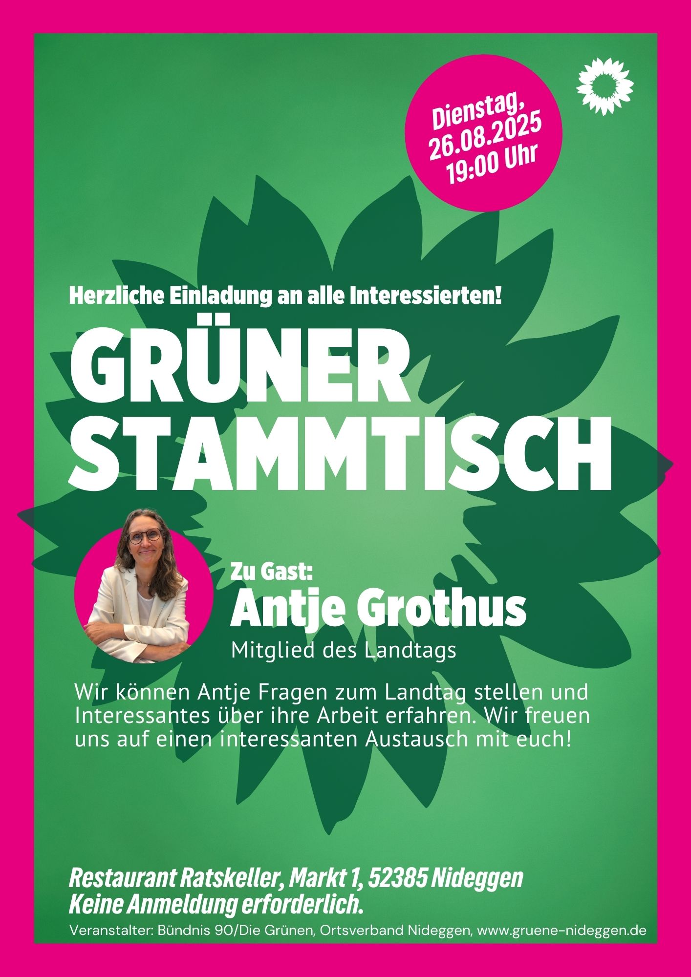 Wir freuen uns auf den Stammtisch mit Antje Grothus aus dem Landtag, die uns interessante Einblicke in Ihre Arbeit gibt.